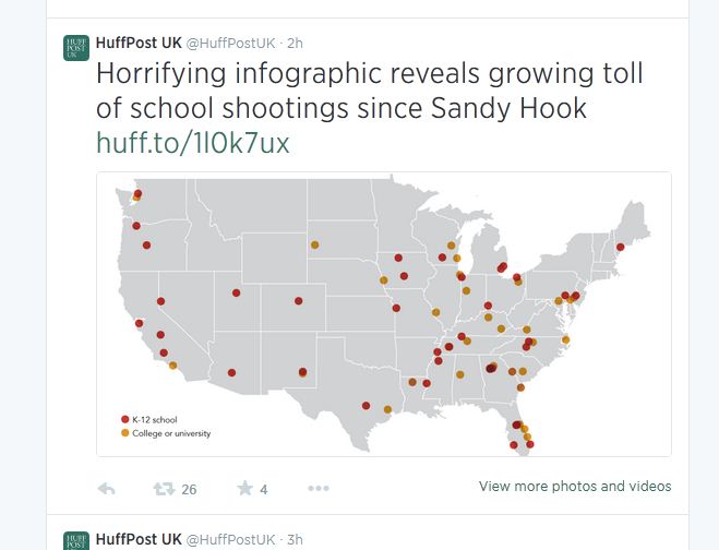 The raw “data,” presented in a table on the Everytown web site, were transformed into a graphic by Zee Maps and promoted on the Twitter feed of Huffington Post deputy managing editor Mark Gongloff.  The map was later published on the Huffington Post website under the title, “There Have Been 74 School Shootings Since Newtown.”