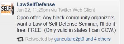 Based on a symposium on gun violence I attended at the historically black public university, Winston-Salem State, I would say there is considerable interest in the black community in the law of self-defense. I’ll be interested to hear from Branca whether anyone takes him up on the offer.