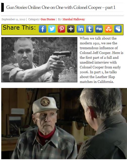 Browsing the internet for videos of Cooper – I was actually looking for the DVD “Man in Full” – I came across a series of interviews Michael Bane did with Cooper in 2006, not long before Cooper died. The interview video is broken down into five parts, all accessible from Bane’s Down Range TV website (as of March 2015).