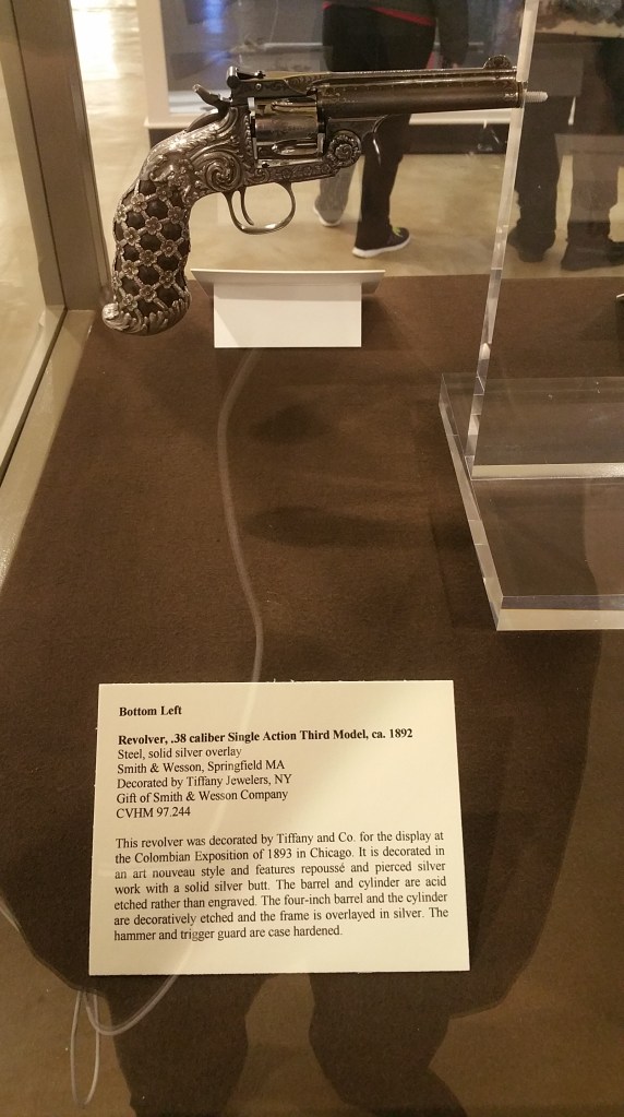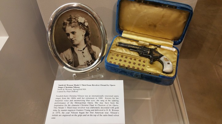 The self-defense aspect of gun culture was also evident, most interestingly with this 3rd gen S&W Model 1 revolver given by D.B. Wesson in 1870 to opera singer Christina Nilsson (whose initials are engraved on the grips). (Though the museum information does not indicate whether she carried the gun for self-defense or whether it was simply meant as a decorative gift.)