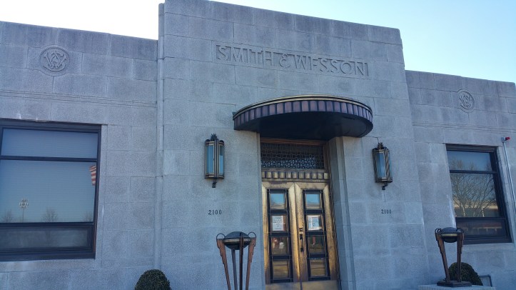 After my tour of the Springfield Armory National Historic Site, I still had some daylight to play with so I drove to see Smith & Wesson’s Springfield, Mass. factory. I knew I would not be able to get inside the compound, and have seen quite a bit of it already on various gun TV shows like Michael Bane’s “Shooting Gallery” and Tom Gresham’s “Guns and Gear” anyway. But I thought it was worth driving by and snapping a couple quick photos anyway. The historic art deco building out front is the most distinguishing part of the whole place anyway, which otherwise looks like what it is: a working factory.