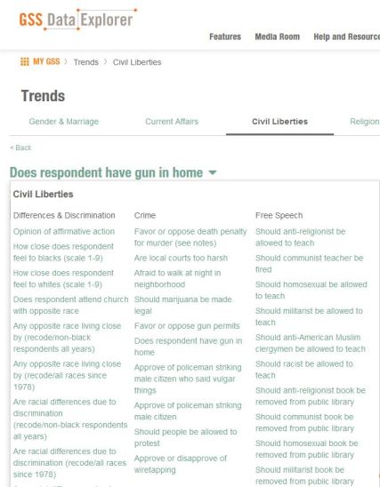 If you go to the page, you can find the question “Does respondent have gun in home” under the broader “Civil Liberties” category (it’s in the Bill of Rights after all!), and within that under the “Crime” category (oh, well, can’t win ’em all!)