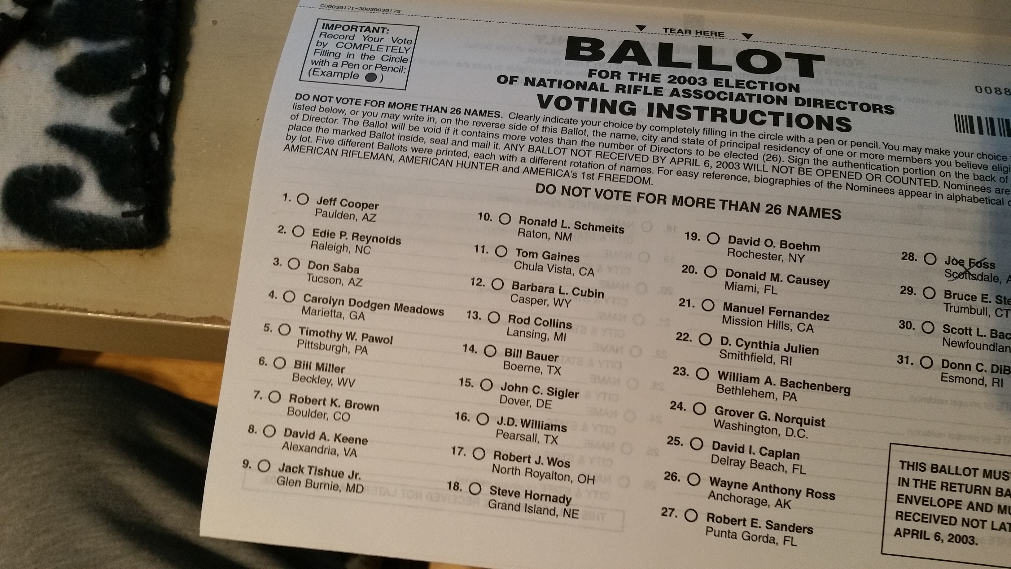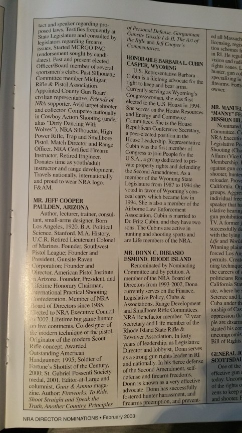 In the February 2003 issue, we find the ballot for the 2003 election of the National Rifle Association directors. #1 on the ballot is man-myth-legend Jeff Cooper of Paulden, AZ.
