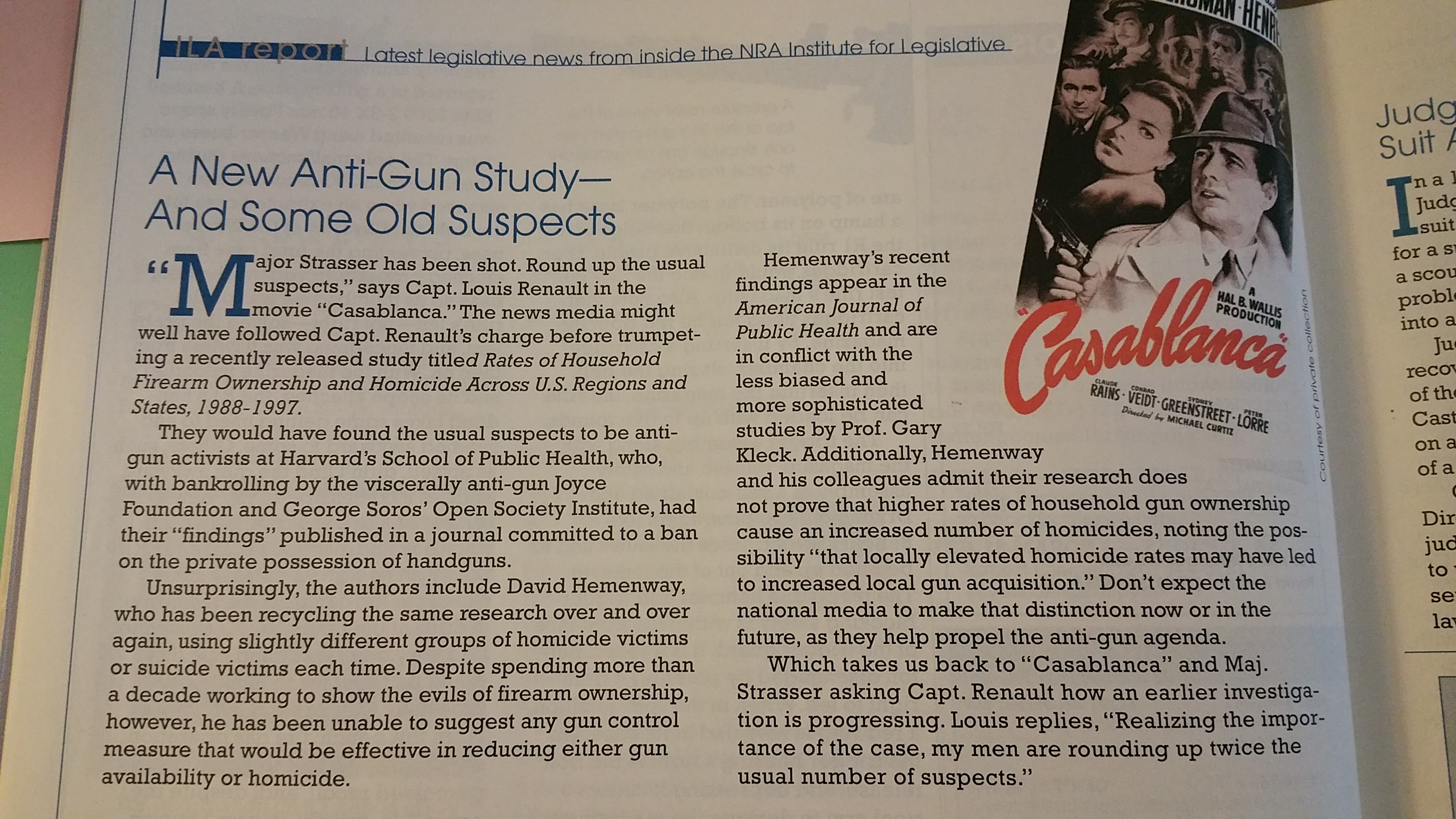 On the page opposite the Bellesiles story is a criticism of a study about guns and homicide published in the American Journal of Public Health. While it is not surprising that the NRA would criticize this research, the author’s humorous approach of drawing on “Casablanca” to make a point about “the usual suspects” as authors of the research made me chuckle. Beginning with Capt. Louis Renault’s instruction: “Major Strasser has been shot. Round up the usual suspects.” And concluding with Renault’s report to Maj. Strasser: “Realizing the importance of the case, my men are rounding up twice the usual number of suspects.”