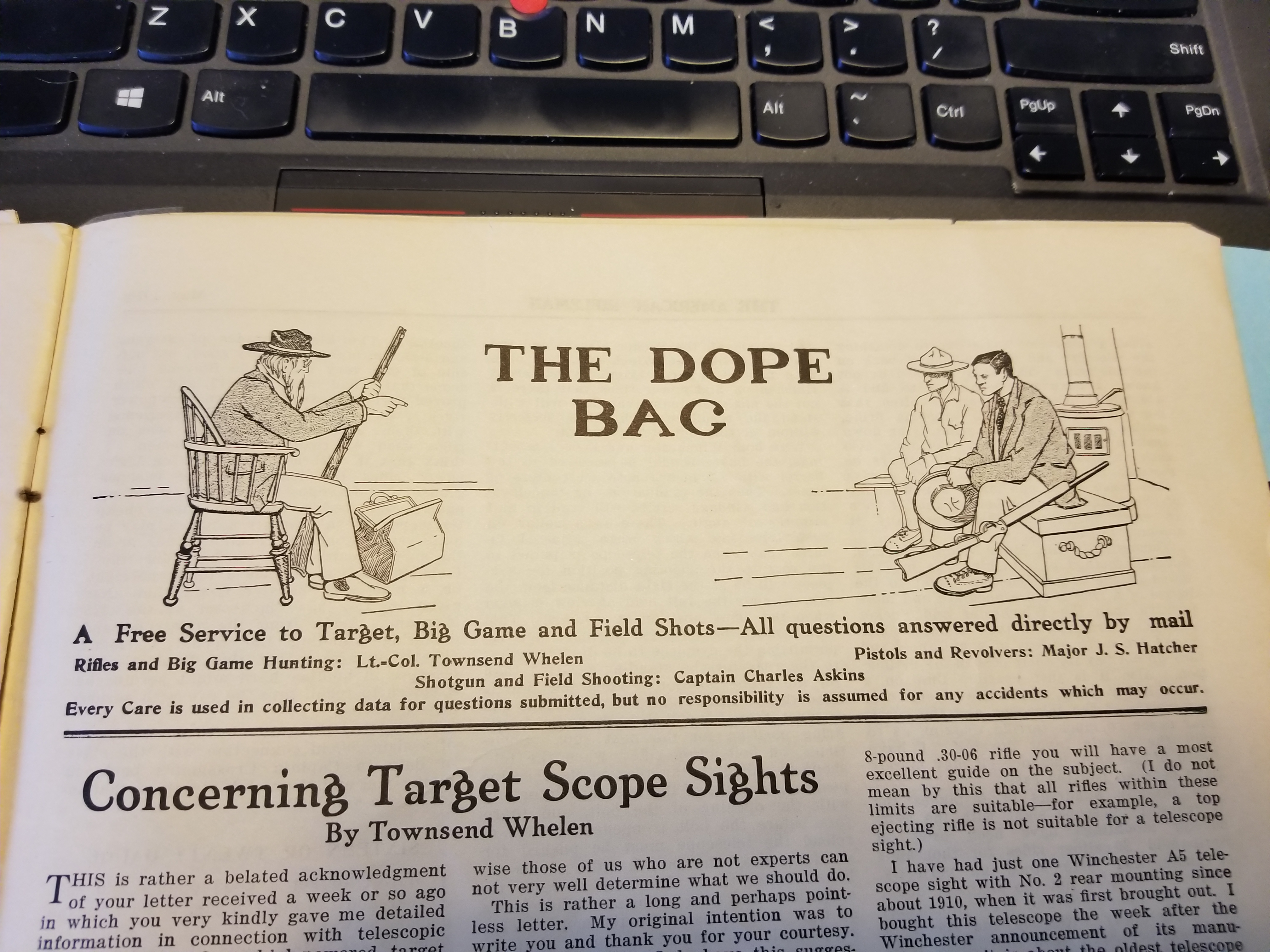 I have mentioned “The Dope Bag” previously (an issue from 1927 in which a husband was seeking advice on a revolver for his wife to use in defense against prowlers, etc. in his absence). The May 1928 issue has an interesting series of 6 questions posed by reader R.A.B. “concerning pocket guns.”