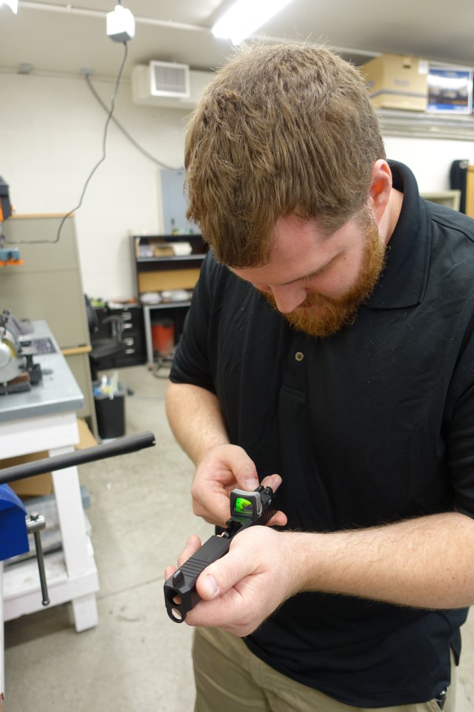 Mike inspecting a Suarez International Red Dot Slide. Photo by David Yamane