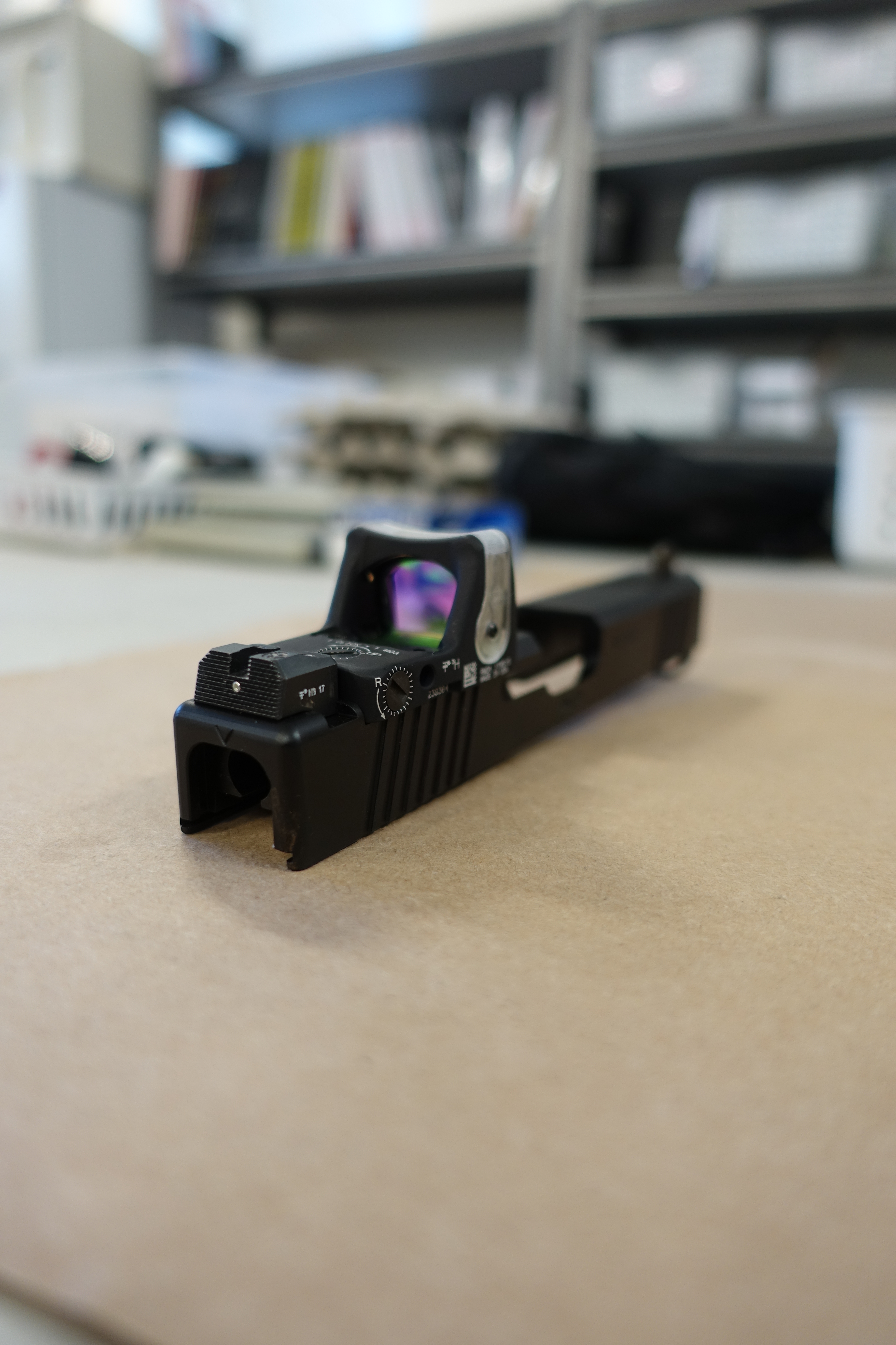 Mike inspecting a Suarez International Red Dot Slide. Photo by David Yamane
