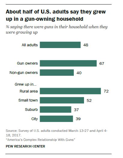 According to the Pew report, “About four-in-ten who grew up in a gun-owning household say they currently own a gun (42%), compared with 19% of those who didn’t grow up with guns in their household” (p. 23).