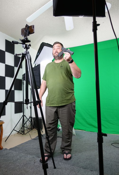 With over 600,000 subscribers and 20 million views a month, Active Self Protection is one of the leading gun-related channels on YouTube. But nothing about Correia screams “Social Media Sensation.” He works at a small desk in the corner of a bedroom which was converted into an office and studio when his son joined the Navy after high school. Correia himself is a Navy veteran and sports a full beard, but his resemblance to a SEAL ends there. He served as a Nuclear Option Electronics Technician, which sounds more impressive than Correia’s characterization: “I made hot water.” In studio the day I visited he wears flip-flops and a t-shirt, and endures his share of fat jokes in the comments on his channel.