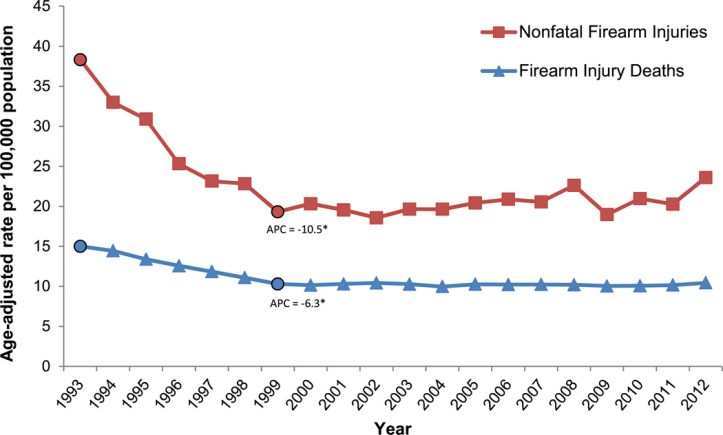 And as researchers from the Centers for Disease Control reported in a 2015 article in Preventative Medicine, firearm injury deaths and nonfatal firearm injuries have been trending downward in recent period.