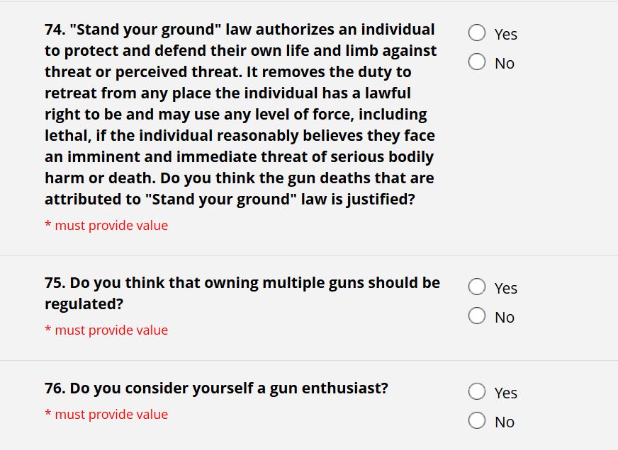 I’m particularly annoyed by #74. It assumes that SYG only applies oneself (pretty sure it applies to assisting others), that SYG only applies to guns, and assumes SYG results in “gun deaths.” Even if the description of SYG had been better, a better question would have been along the lines of “Do you believe ‘standing your ground’ is a justifiable part of valid self-defense?”