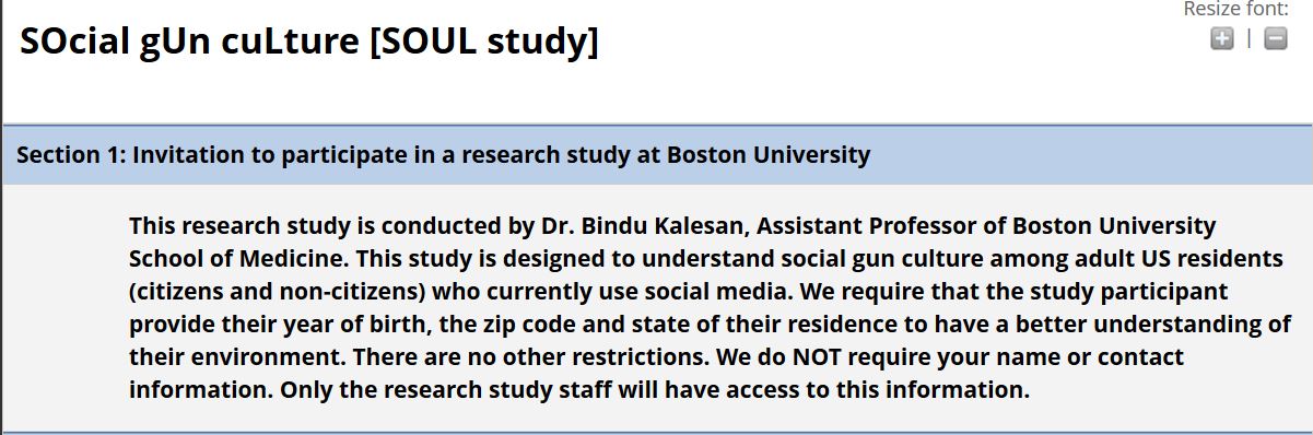 In the first place, the study purports to be “designed to understand social gun culture among adult US residents (citizens and non-citizens) who currently use social media.” But few of the 77 total questions ask about participation in social gun culture.