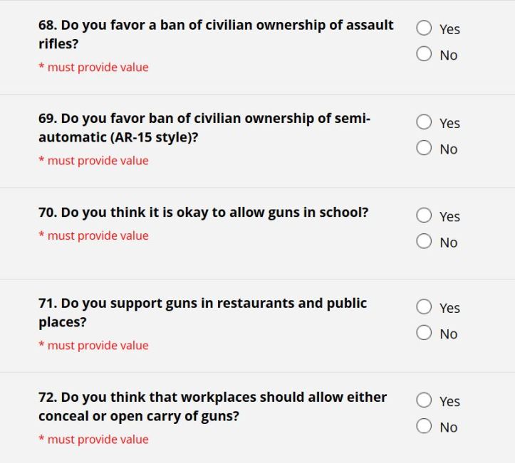 I’m also disappointed in the number of grammatical errors there are in the survey (e.g., “ban of”; “Do you think that workplaces should allow either conceal or open carry of guns?”; “Do you favor a ban of civilian ownership of semi-automatic [AR-15 style]?”). This makes all social researchers look bad.