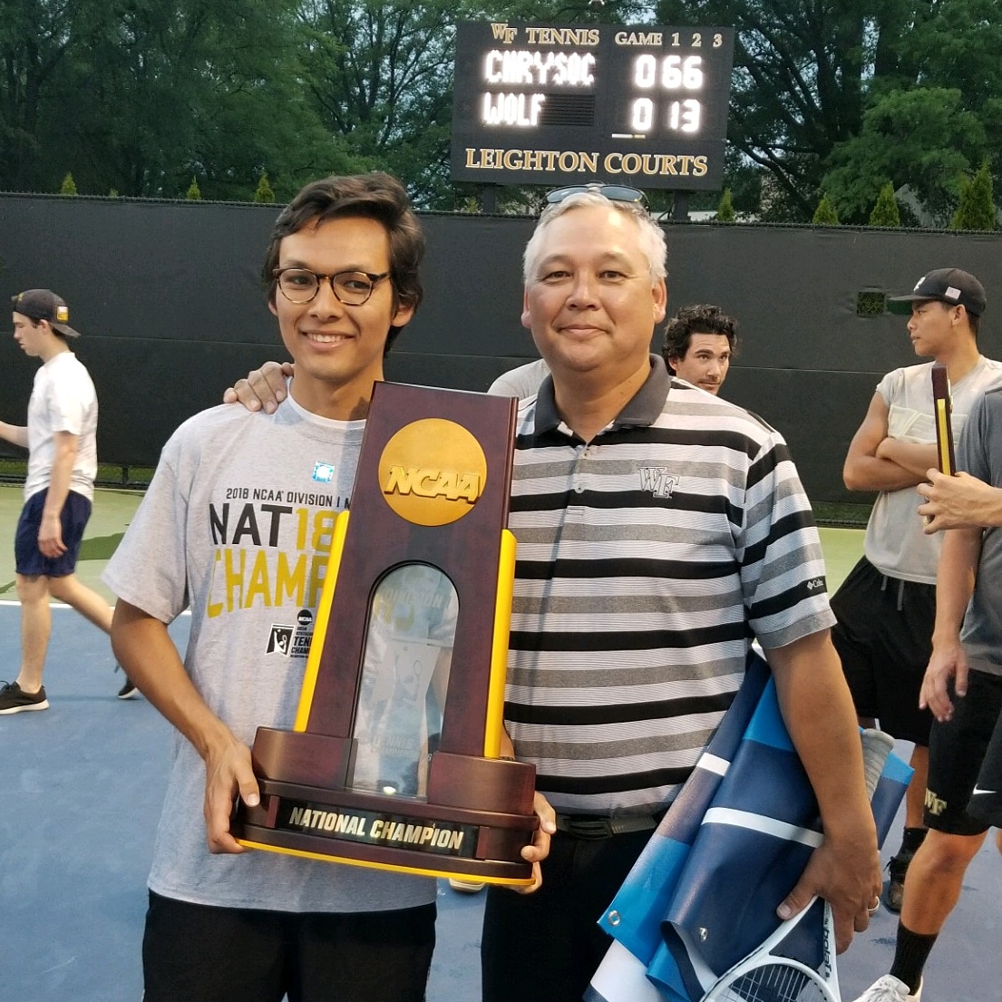 My wife, son, and I have also served year around as the racket technicians for Wake Forest University’s men’s tennis team for the past 10 years. What an amazing feeling, then, when they won the National Championship on our home courts, and Paul and I got to hold the championship trophy – so many years in the making.