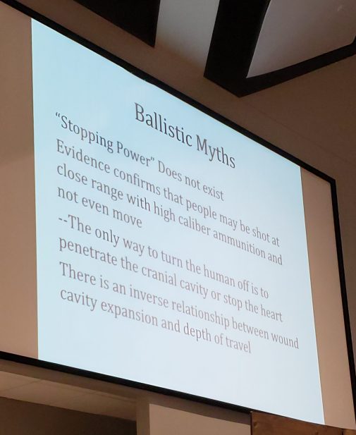 Many of the presenters, as in gun training more generally, came from military backgrounds. Although there is nothing wrong with that per se, models of engagement in civilian contexts can be quite different than in other “theaters of operation.”