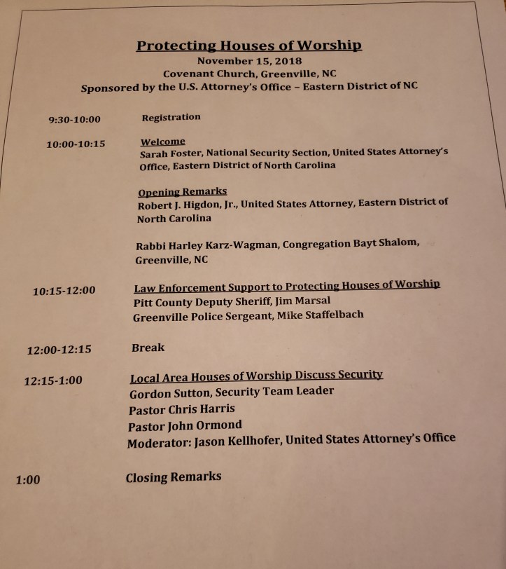 Sadly, the seminar was not scheduled in response to this most recent attack on a house of worship. It was actually stimulated by the massacre at First Baptist Church in Sutherland Spring, Texas, whose first anniversary just passed. And it was the second such seminar organized by U.S. Attorney Robert J. Higdon, Jr. The first seminar was held in January 2018 in Cary and attracted some 400 attendees. This second session held in Greenville had around 100 attendees, mostly from Christian Churches, though there were two members of a local synagogue and two members of a local mosque in attendance.