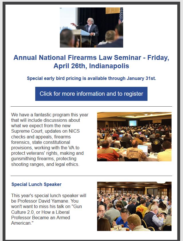 I have known for a couple of months but did not want to say anything until it was officially announced: I am giving the lunch presentation this year at the National Firearms Law Seminar in Indianapolis, April 26th.