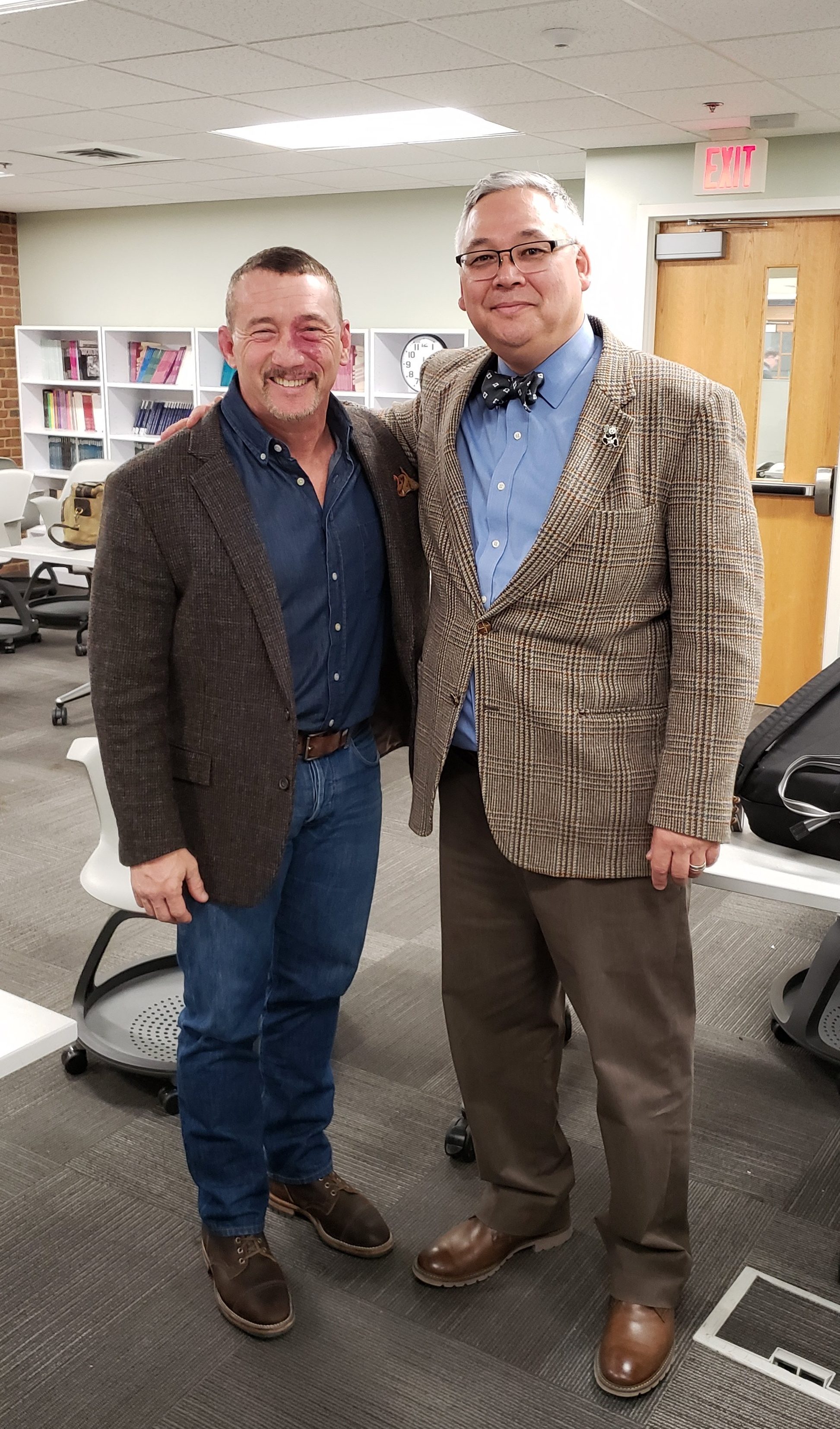Douglas’s visit to my class was followed by his teaching an Extreme Close Quarters Concepts course near Winston-Salem, which I was fortunate enough to attend. I will have more to say about that experience in forthcoming posts. Suffice to say I was not smiling as much then as I am in the photo below with Douglas. He, by contrast, was.