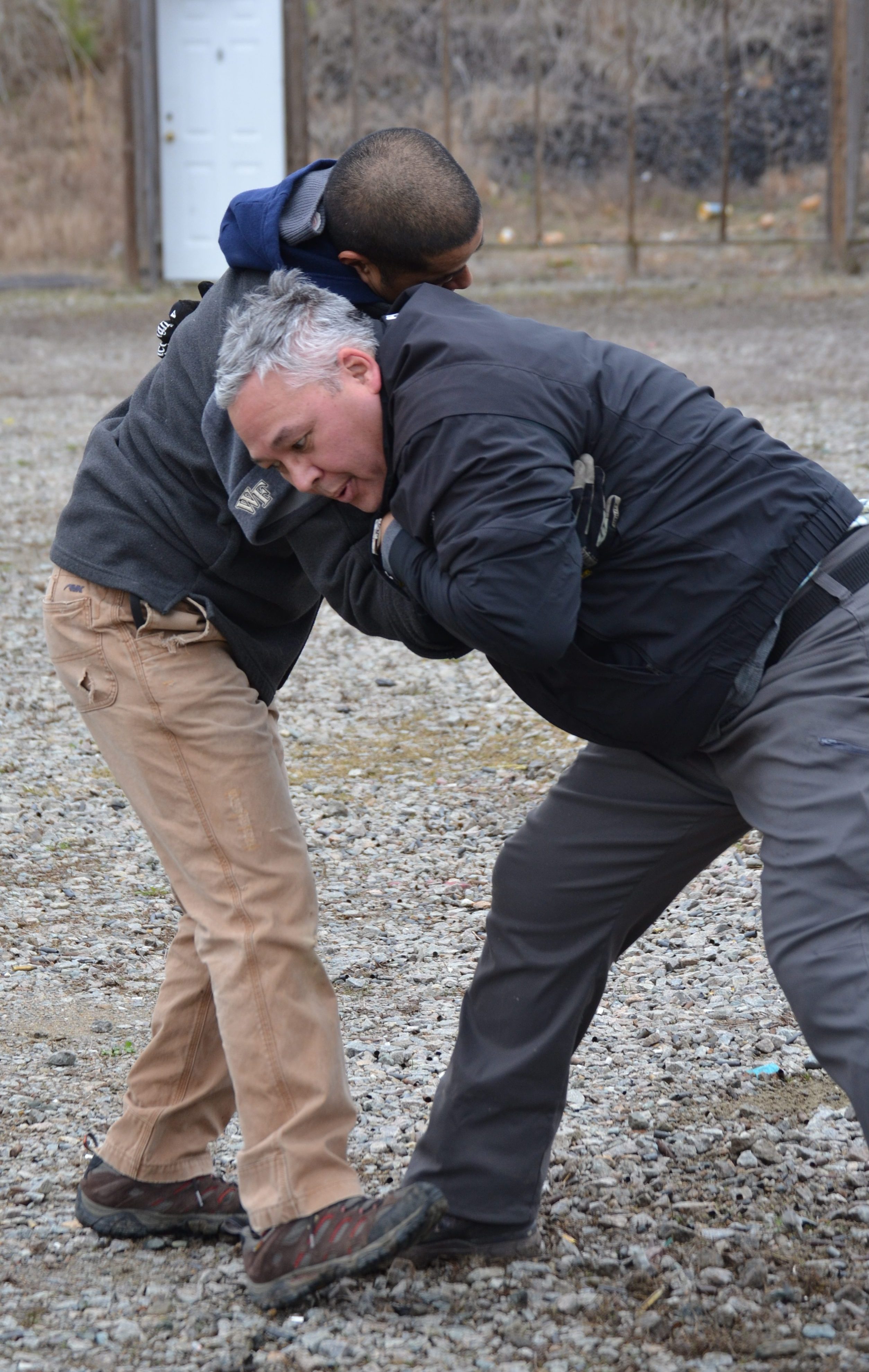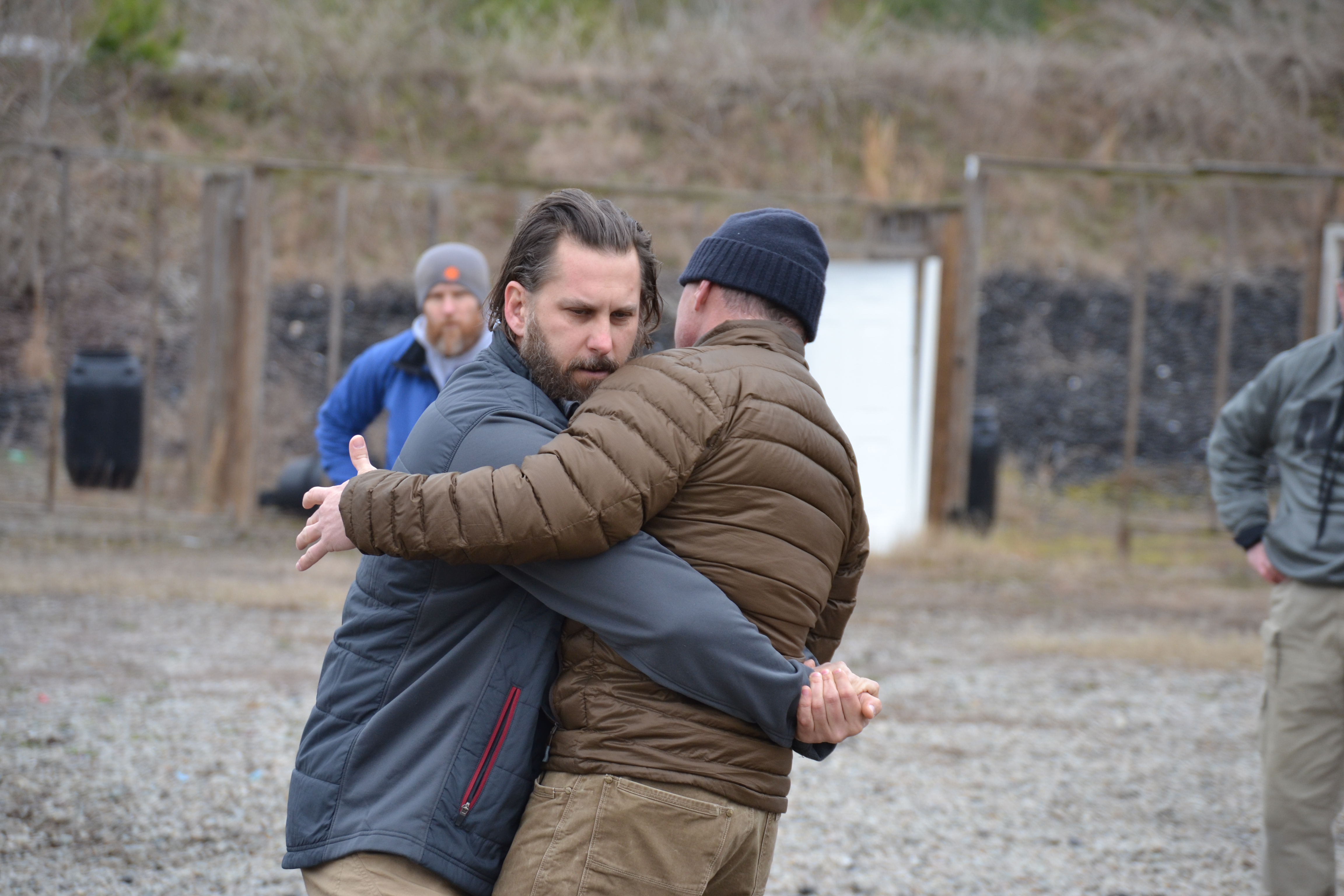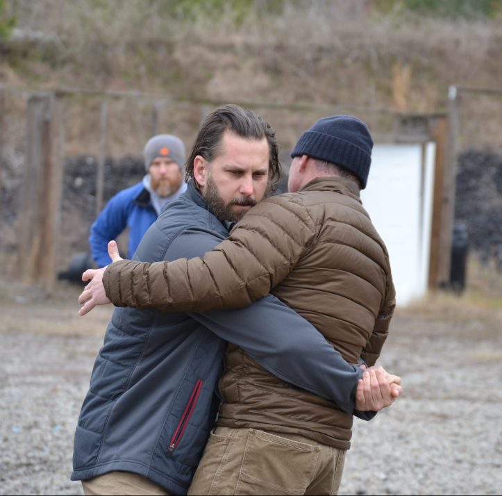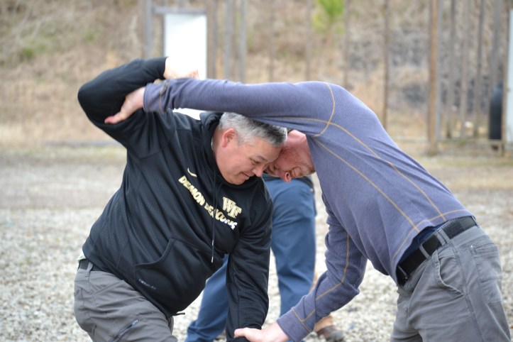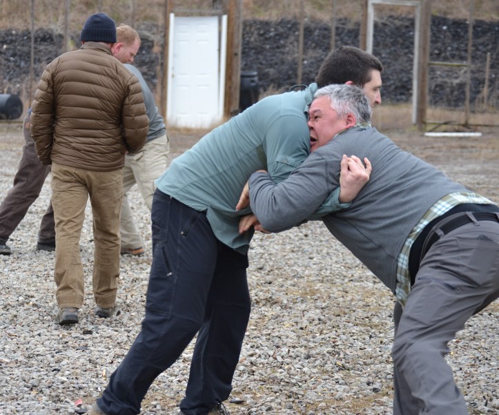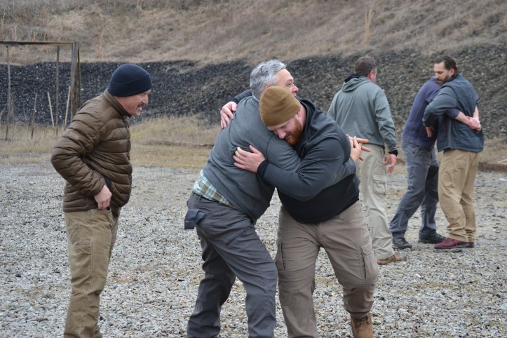 I woke up Saturday morning with tight hamstrings and soreness in parts of my neck that I didn’t know could be sore. After our three hours shooting on the range and a break for lunch, we gathered back out on the range for grappling, which involved short bits of instruction and long stretches of application.