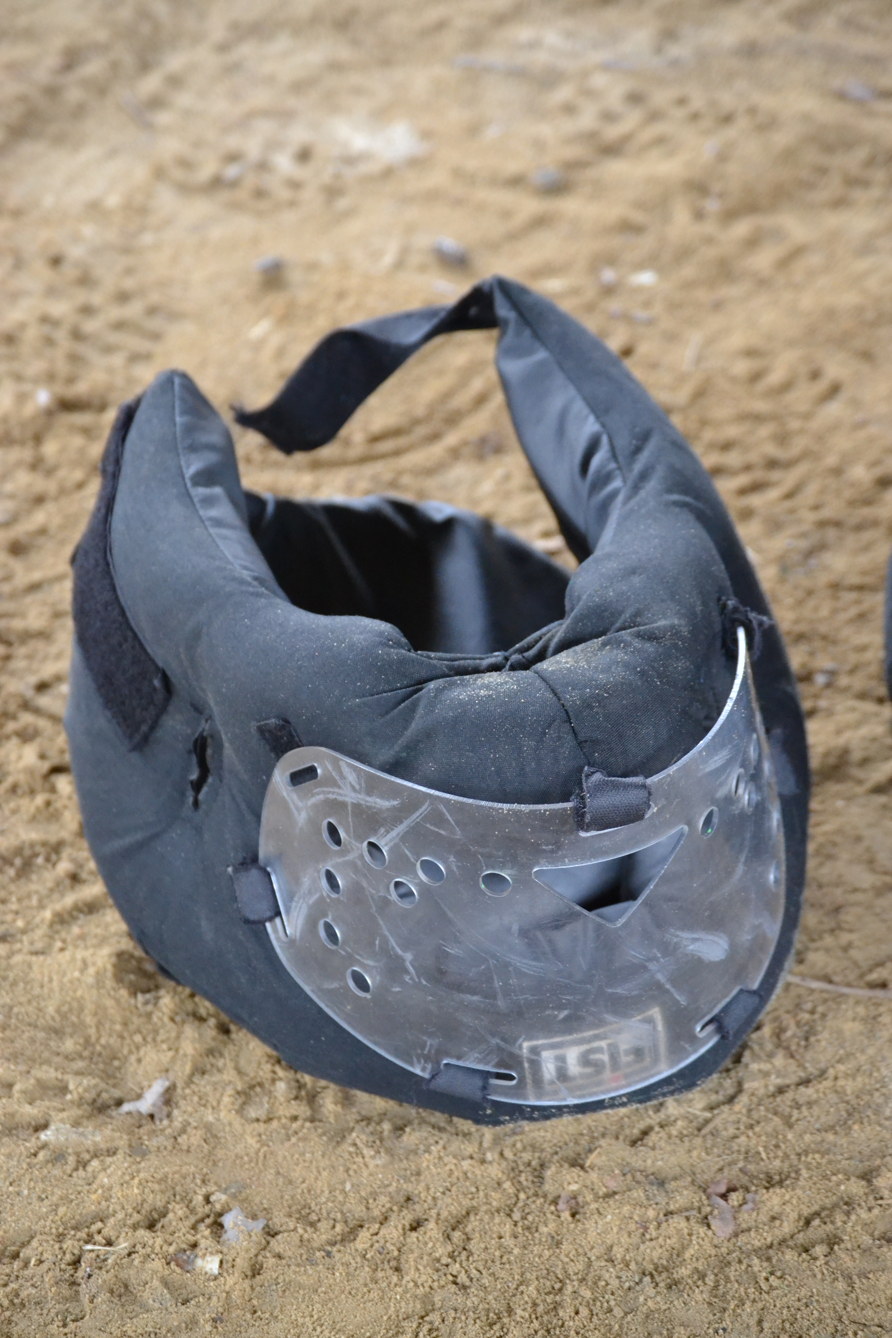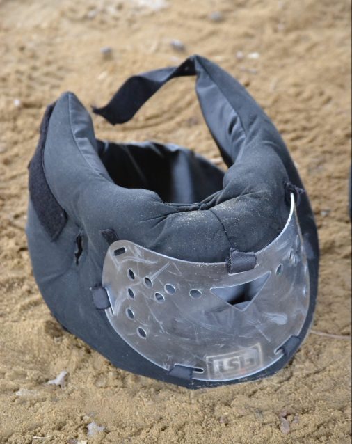 We get in groups of three, with 2 grappling and 1 timing. Each rotation will be 3 minutes long. 3. Minutes. Long. Because we are using marking cartridges, we wear eye protection and a FIST helmet – a padded head covering with a clear plastic face guard. Except these helmets are used so the face guards are somewhat opaque. And as soon as I put it on, my glasses start to fog up. The face guard has several round holes and also a small triangle near the mouth for ventilation, but even before beginning the rotation the airflow seems inadequate.