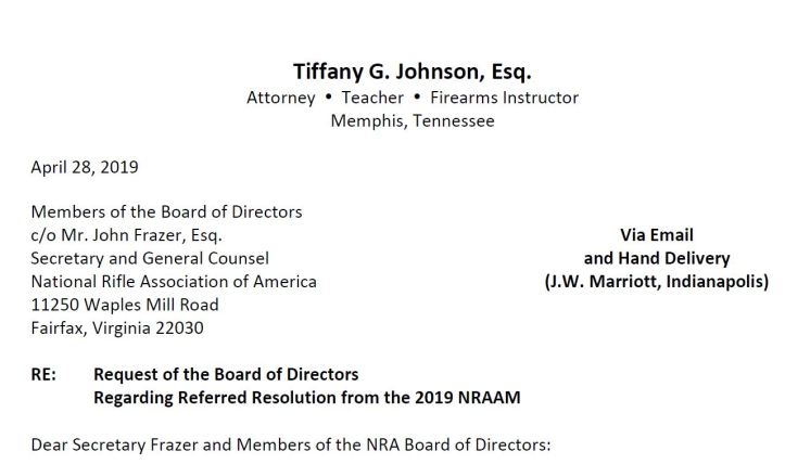 I don’t know that you have to be an ethicist or attend law school to know a conflict of interest when you see one this obvious. But Tiffany Johnson IS an attorney as well as a firearms trainer and supporter of the NRA. She wrote a letter (PDF linked here) to the NRA Board of Directors asking those who have a conflict of interest in the resolution to recuse themselves from consideration.