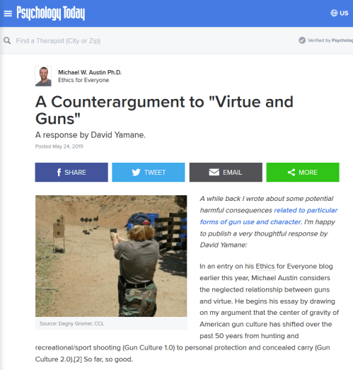 Earlier this year, philosopher Michael Austin posted a short reflection on “Virtue and Guns” on his Psychology Today blog “Ethics for Everyone.” If the title didn’t already grab my attention, the subtitle would have: “How ‘Gun Culture 2.0’ can harm character.”