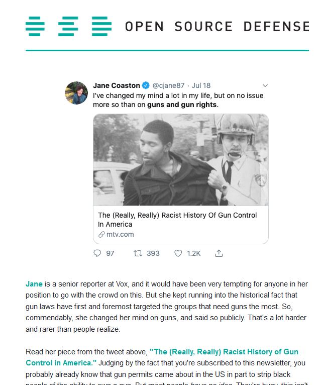 Follow their blog, sign up to receive their digital newsletter by email, or find them on Twitter (@opensrcdefense), Instagram (@opensrcdefense), or Reddit (/r/opensourcedefense). Whether you agree or disagree with their positions, I think you will benefit from exposure to their ideas.