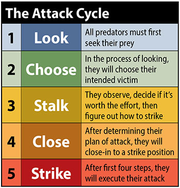 4. “CLOSE: After determining their plan of attack, they will close-in to a strike position.” The key to breaking the attack cycle at this point is maintaining distance.