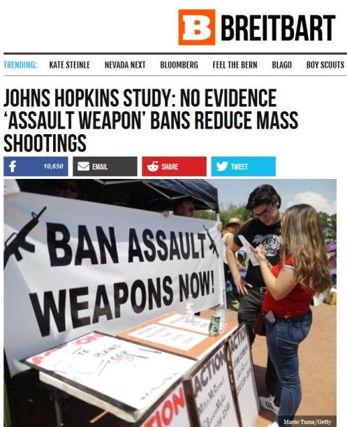 Screen cap of https://www.breitbart.com/politics/2020/02/18/johns-hopkins-study-no-evidence-assault-weapon-bans-reduce-mass-shootings/ on 2/19/2020.