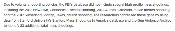 In fact, as the article explains at greater length, it is the FBI’s Supplemental Homicide Reports that omit not just the Sandy Hook Elementary School shooting, but also the Aurora, CO movie theater shooting (2012) and the Sutherland Springs, TX church shooting (2017).