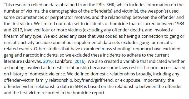 No research is perfect, and some of these exclusions highlight the need for better data for scholars to work with. The authors of this study appropriately point out the limitations of their data. The recognize that what they are trying to explain are “rare events.” They “acknowledge that our results are influenced by the definition [of mass shooting] that we have chosen.”
