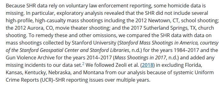 Finally, I do not know what the possible implications of these exclusions are, but the authors exclude “Florida, Kansas, Kentucky, Nebraska, and Montana from our analysis because of systemic Uniform Crime Reports (UCR)–SHR reporting issues over multiple years.”