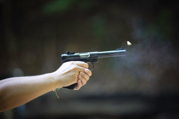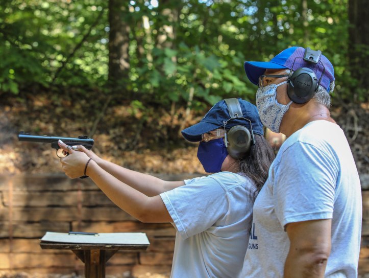 Sociology of Guns student shooting .22 pistol at gun range. Photo by Robin Lindner/RLI Media