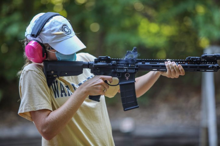 At the range, I briefly re-reviewed range safety, firearms safety, and our medical plan (which included my wife Sandy, a Doctor of Nursing Practice, who was in attendance). Then each student was invited — though emphatically NOT required — to shoot a Ruger Mark III .22 caliber semi-automatic pistol, a Glock 48 9mm semi-auto pistol, and an AR-platform .223 semi-auto rifle. (One student brought her own Glock 19.)