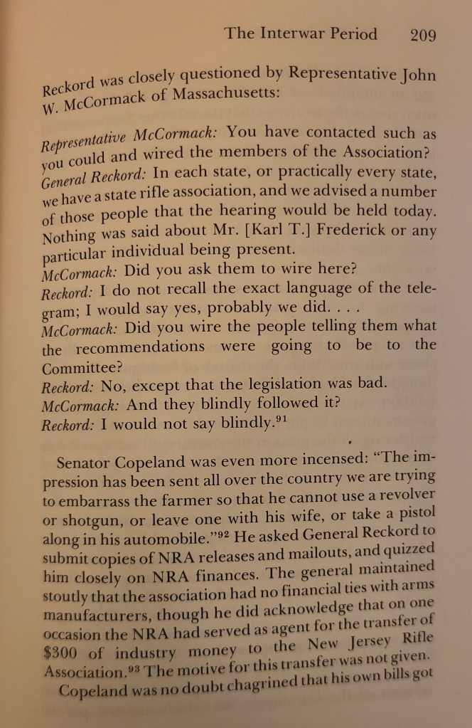 In hearings about Attorney General Cummings’ National Firearms Act, “the NRA conjured up the specter of compulsory registration of all firearms” (p. 208) — part of what Frank Smyth in his “unauthorized history” calls the modern NRA’s “Creed.”