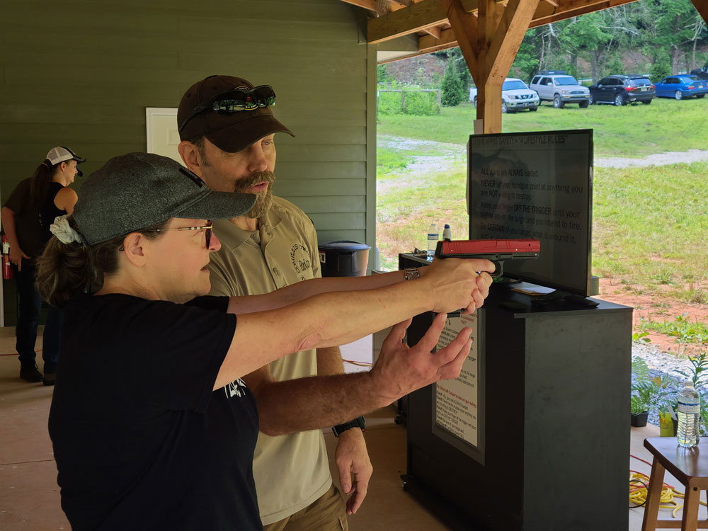 After reviewing again the range and safety rules, Shelley and Brian very deliberately help get everyone with a cleared gun in front of them on their table. We practice our presentations with and without a trigger press, both from the low ready and compressed ready positions. Shelley, Brian, and a couple of additional experienced trainers who happen to be on hand give the students plenty of individual attention here.