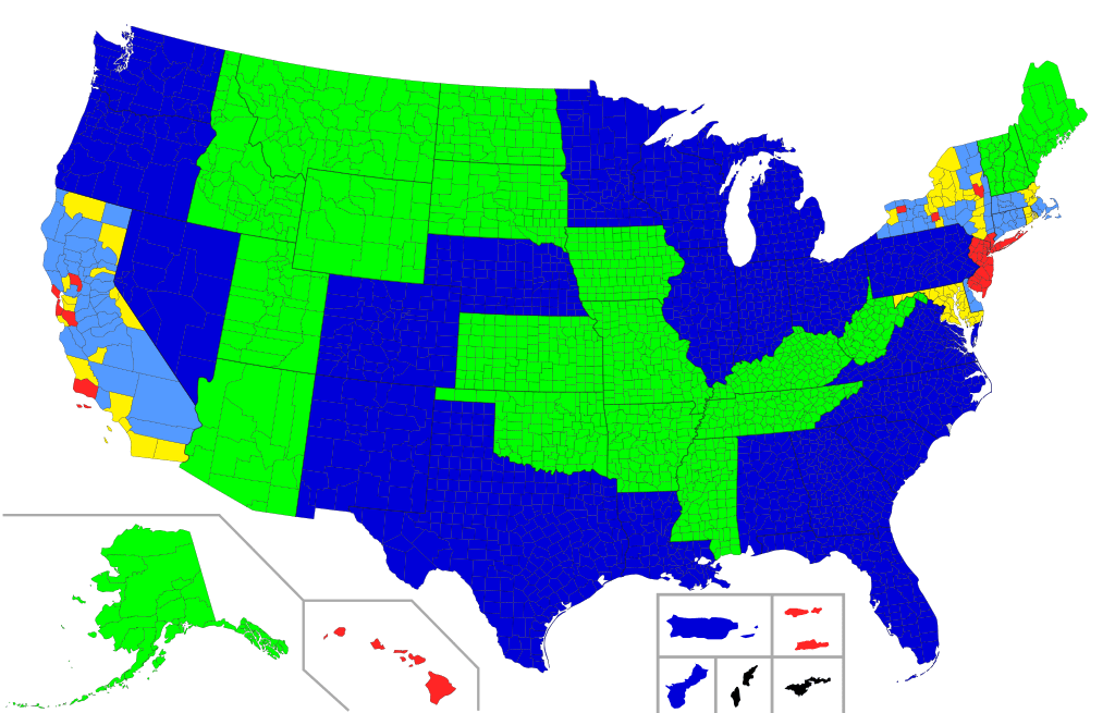 The county-level perspective in this graphic highlights some of the county-level variations within may issue states – red is de facto no issue, yellow is may issue, and light blue is de facto shall issue.