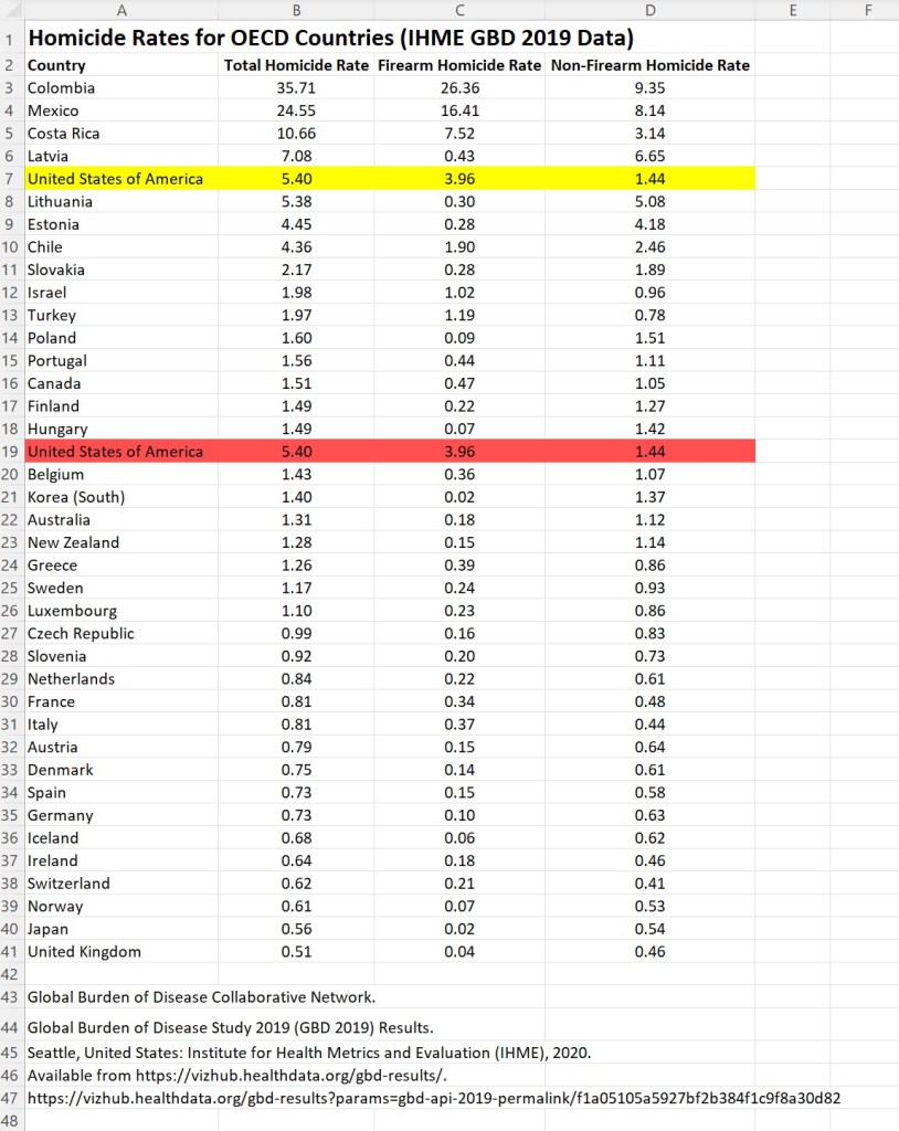 America is also exceptional among its peer nations in its rate of firearm-related deaths. Here I will focus on homicide using 2019 data from the Institute for Health Metrics and Evaluation (IHME) Global Burden of Disease (GBD) study for the 38 member nations of the Organisation for Economic Co-operation and Development (OECD). These are high-income, high human development index, developed nations which provide an appropriate peer comparison group for understanding homicide rates in the United States.