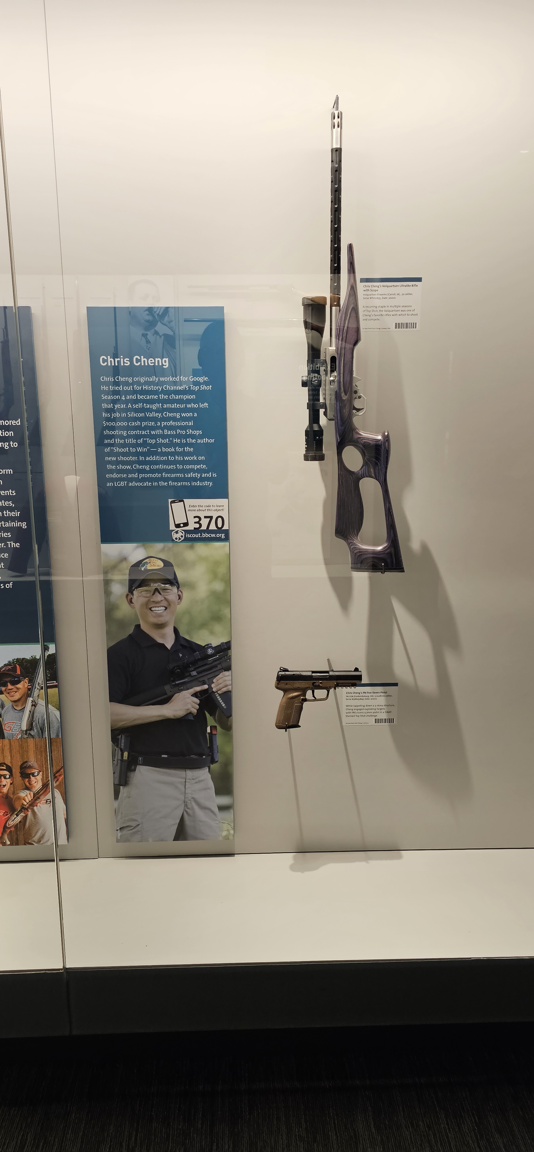 I liked this display both because it covered one of my bucket list items (cross-country skiing and shooting, i.e., biathalon), and because there were items from two people I’m fortunate to have gotten to know some in my travels through gun culture: professional shooters Julie Golob and Chris Cheng.